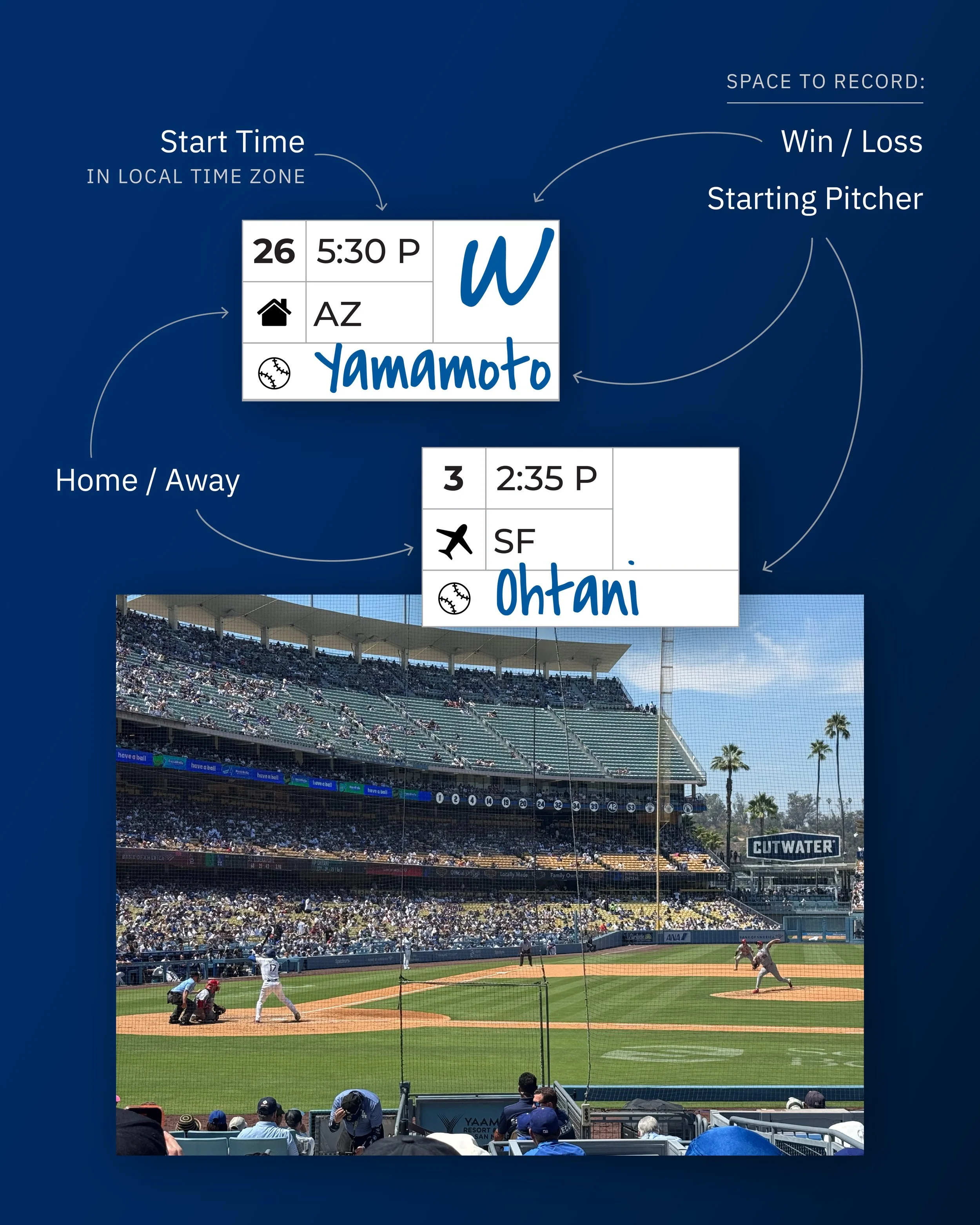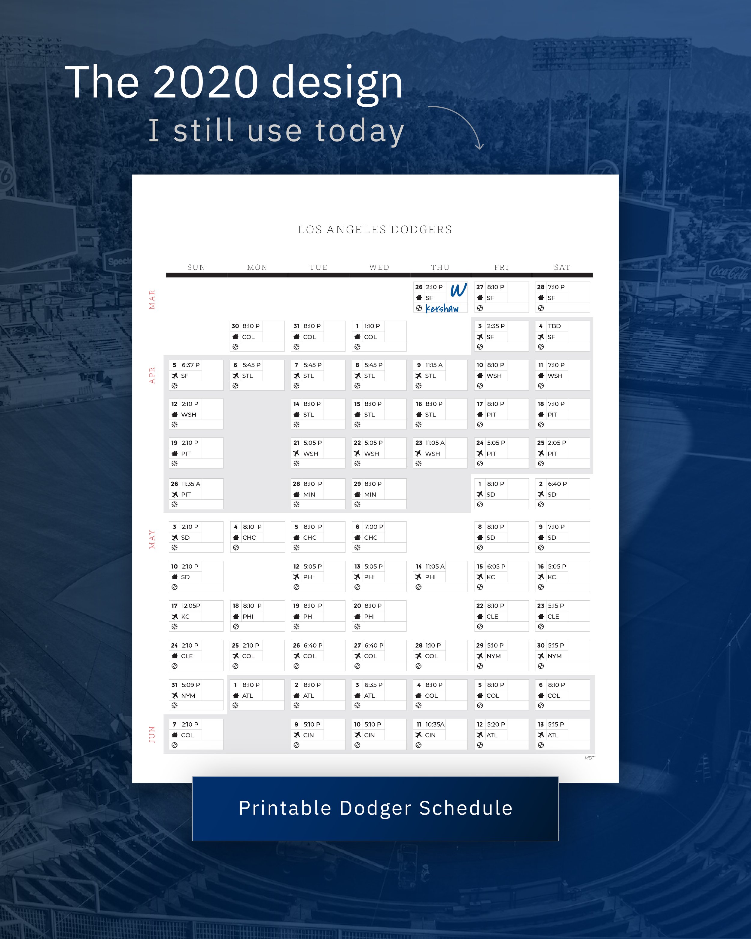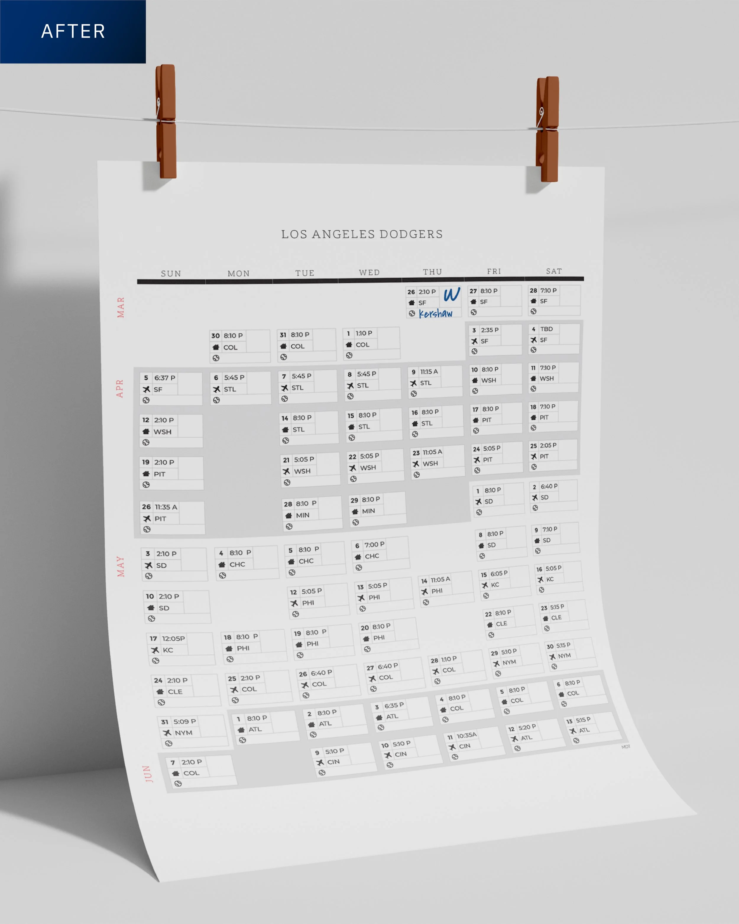 Minimal. Intentional. Something you’d actually want to print and live with for an entire season. I added space to track what mattered to me: starting pitchers, wins and losses, the rhythm of a long season. And because details matter, I set every game time to Mountain Time, where I was living at the time. No conversions, no friction.